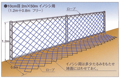 商 品 説 明 サイズ 1.2m(+0.8mタレ部)×50m 目合 10cm 用途 イノシシ用防獣網 特長 ●張り易い 軽くて強い 長年使える ●耳糸(黒)380D×75本撚糸 ●本体糸(青)380D×72本撚糸 メーカー 東京戸張 関連ワード: 防獣ネット 防獣フェンス アニマル 仮設ネット イノシシ 猪対策 猪ネット 作物 農業 バリヤ 【防獣ネット各種】 ■ 防獣ネット (イノシシ用B) 10cm目合 1m×50m ■ 防獣ネット (シカ用A) 10cm目合 2m×50m ■ 防獣ネット (イノシシ用C) 10cm目合 1.2m(+0.8mタレ部)×50m